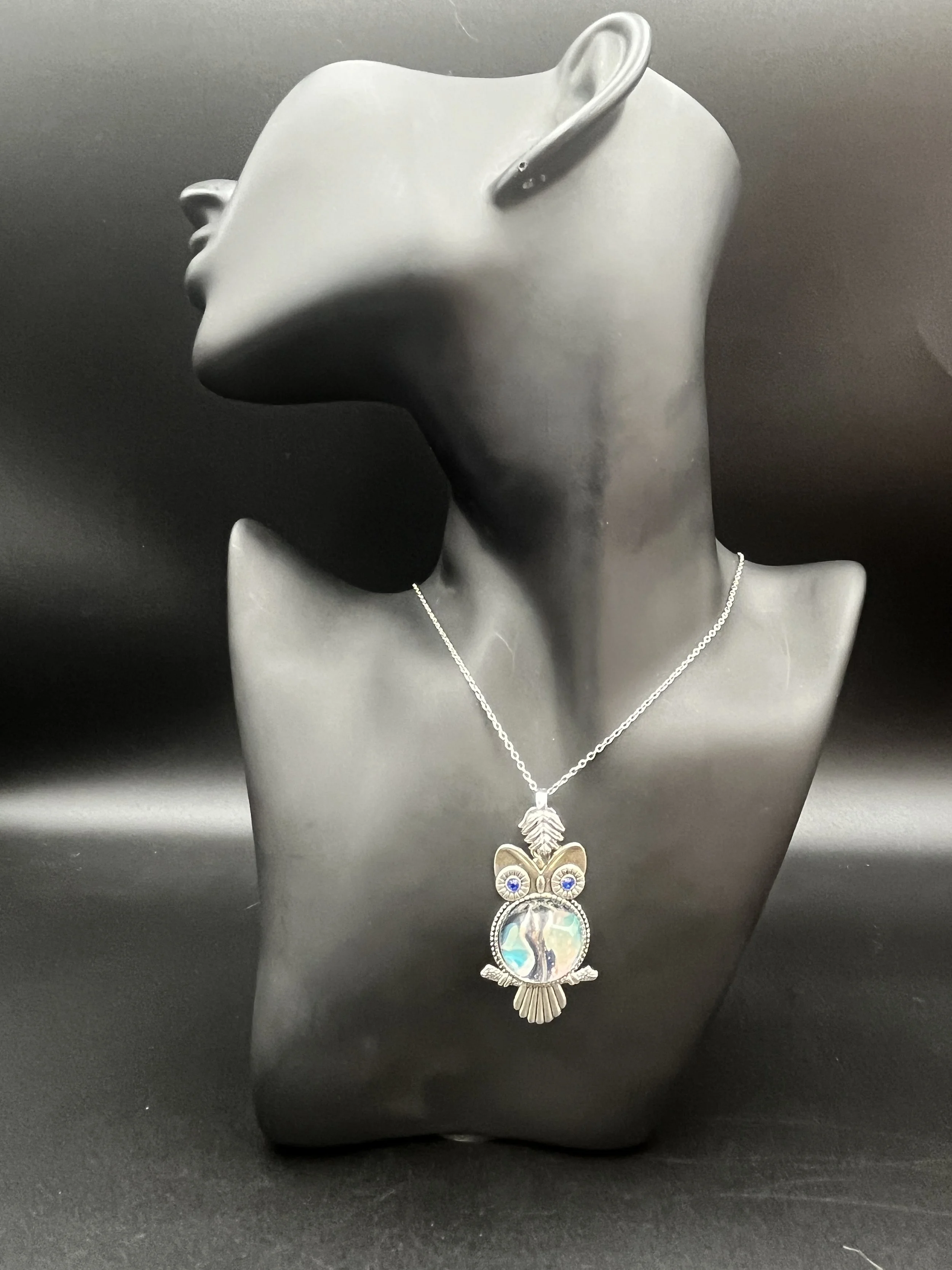 Sparkling blue eyes shine brightly in an owl, beautifully framed by a delicate glass dome at its center.