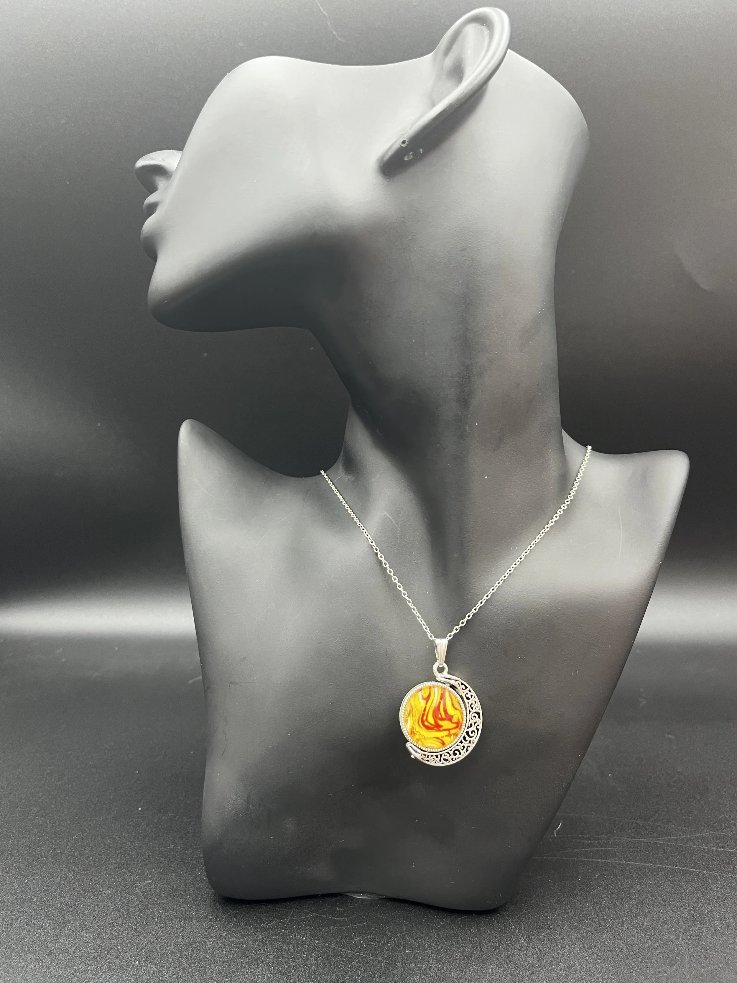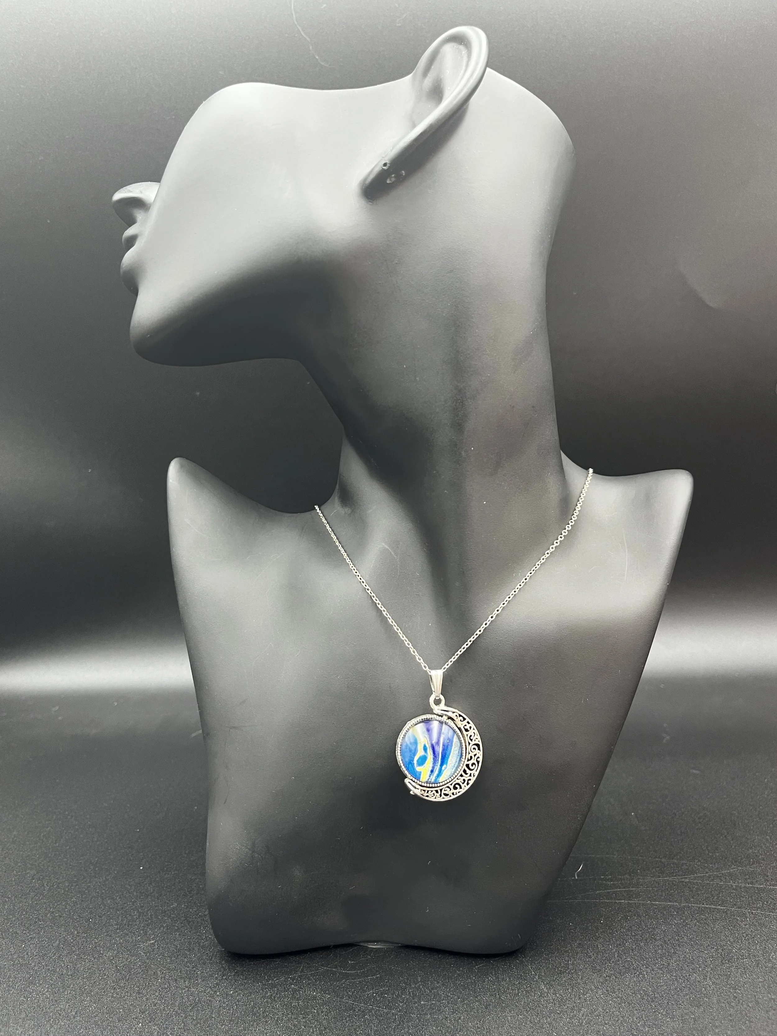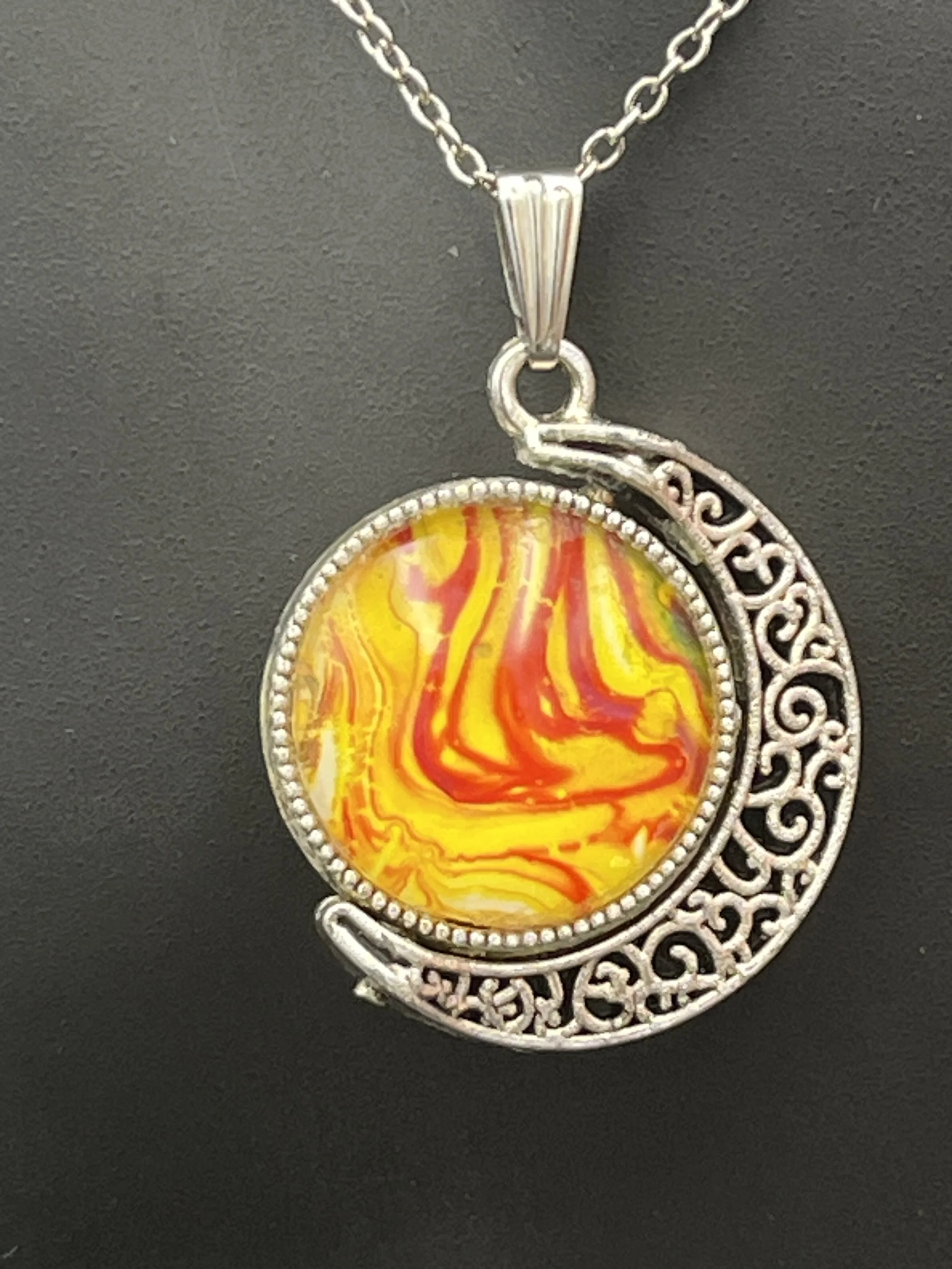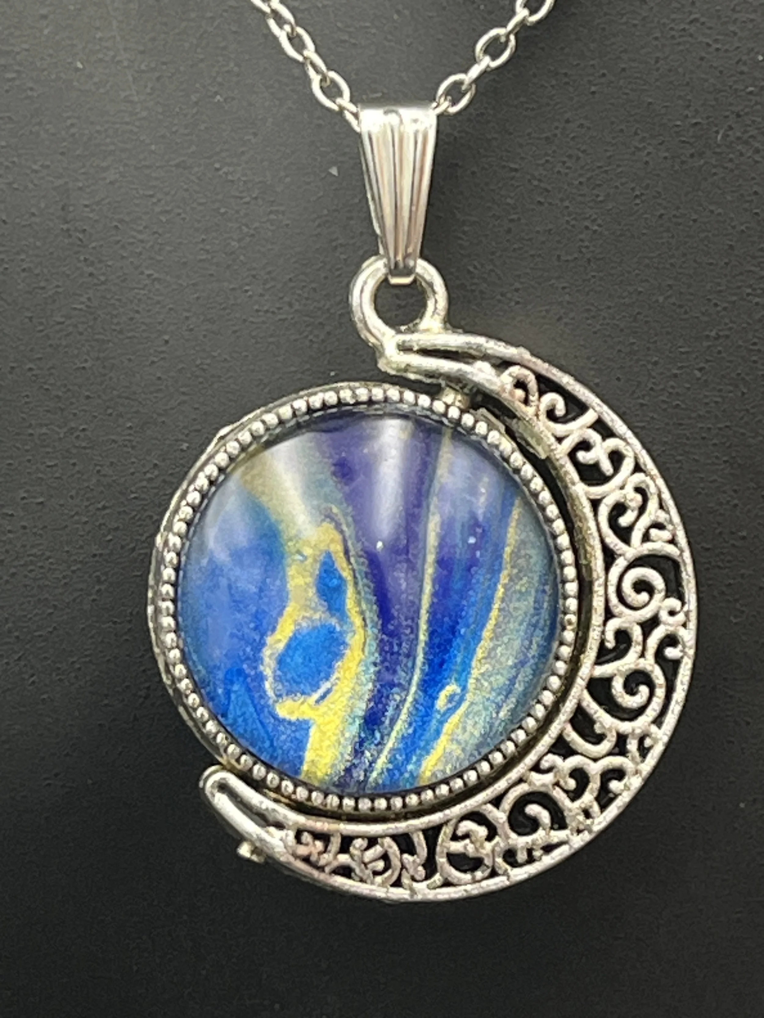 Shop All › Sunflower and Moonflower Image 1 of 4 Image 2 of 4 Image 3 of 4 Image 4 of 4 Sunflower and Moonflower $18.00 A two-sided pendant - one side a deep blue swirl and the other bright sunflower look. Add To Cart Added! A two-sided pendant - one side a deep blue swirl and the other bright sunflower look.