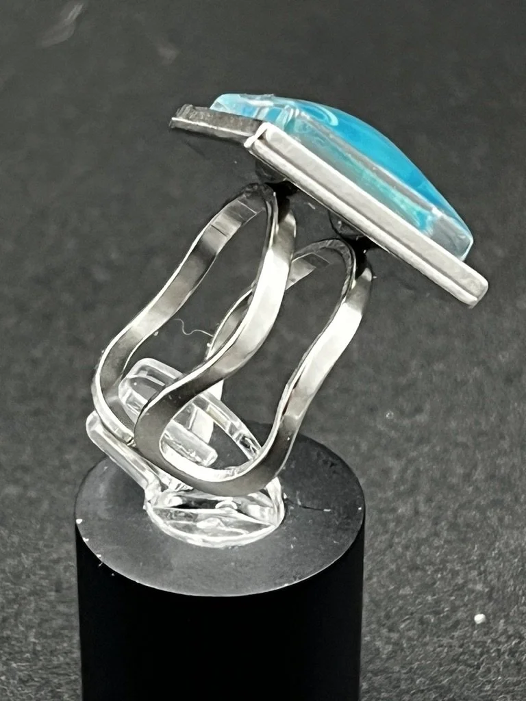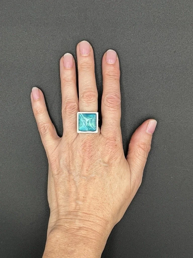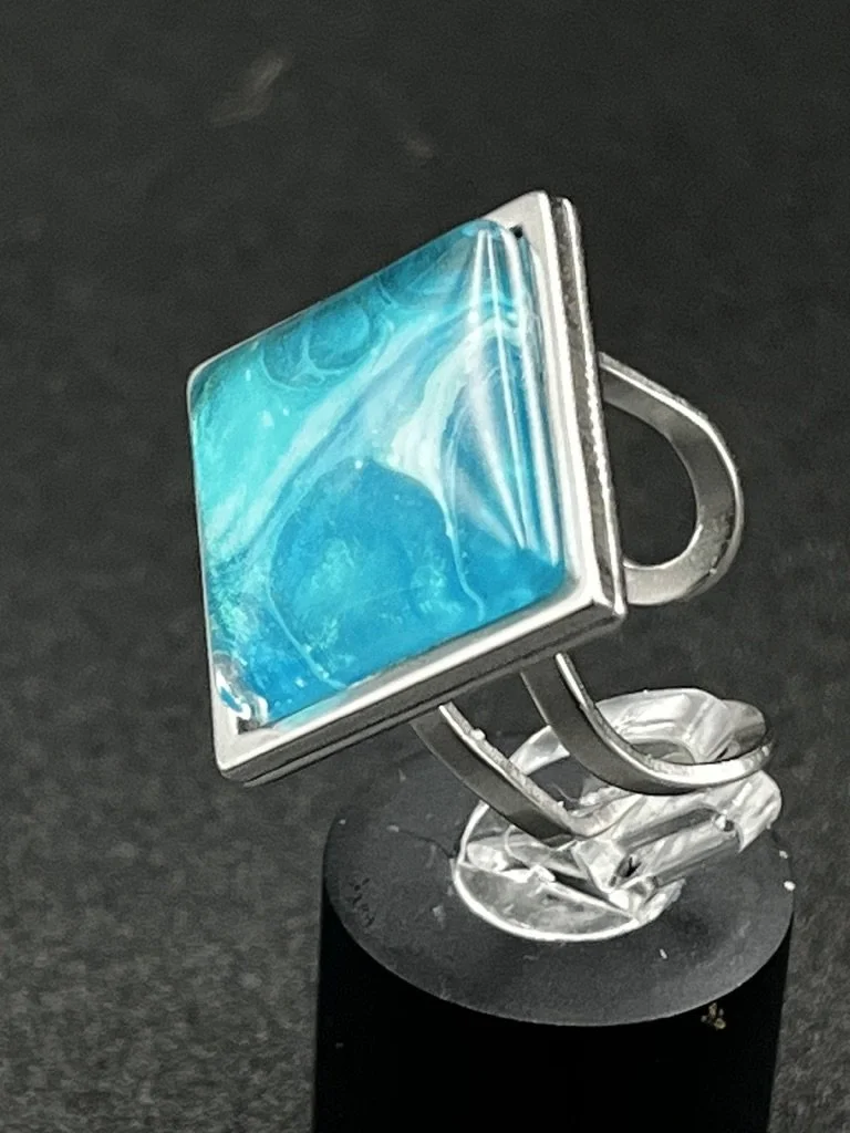 Image 1 of 4 Image 2 of 4 Image 3 of 4 Image 4 of 4 Aquamarine Swirls Statement Ring, Adjustable $22.00 Beautiful light aquamarine colored swirls in a square setting. Add To Cart Added! Beautiful light aquamarine colored swirls in a square setting.