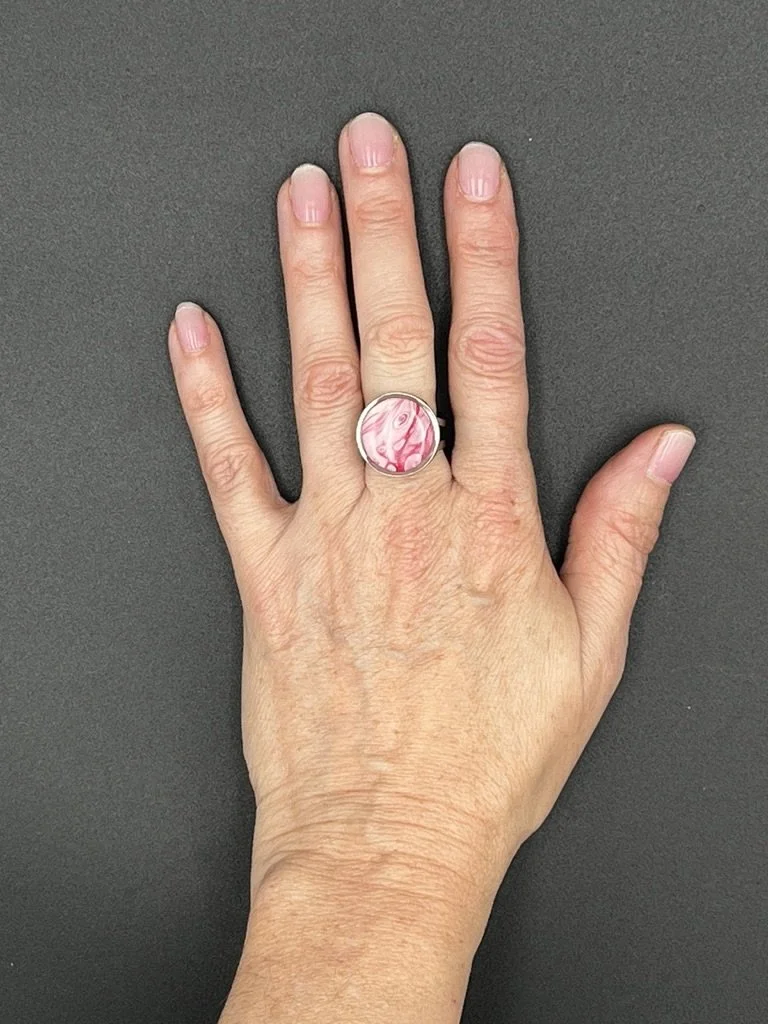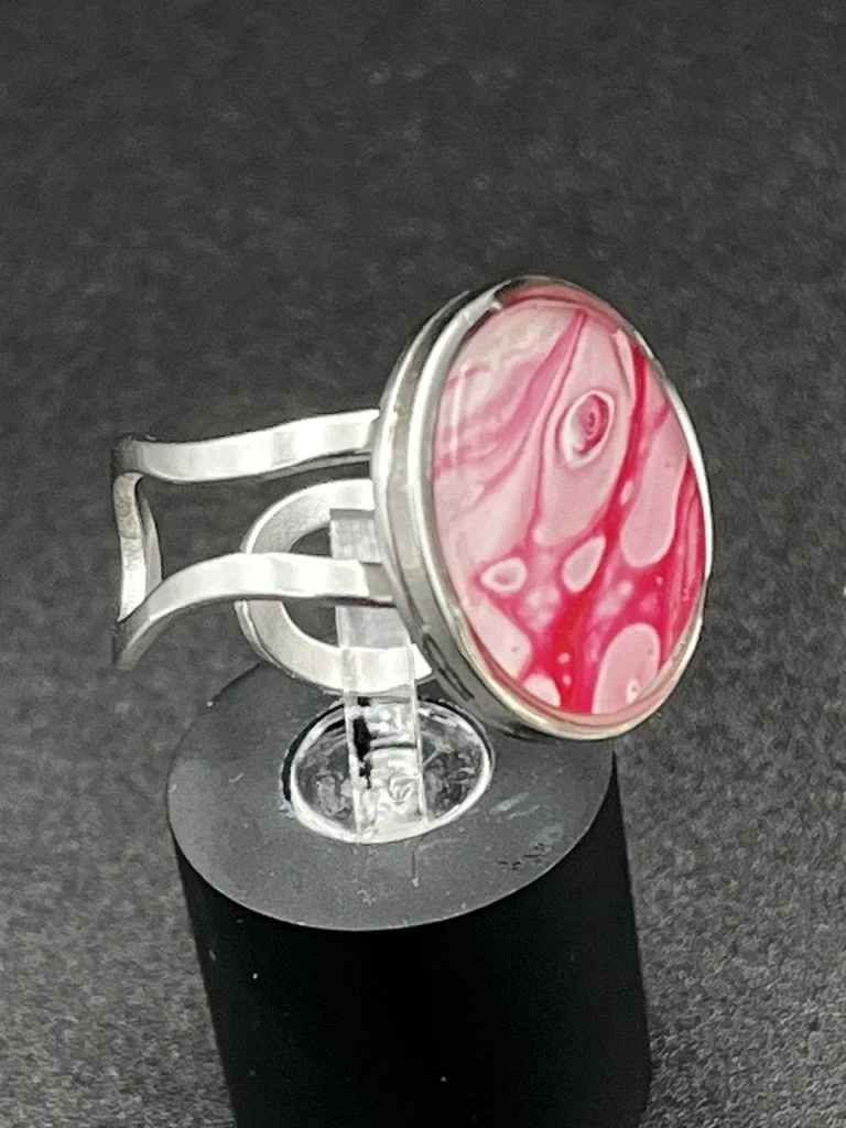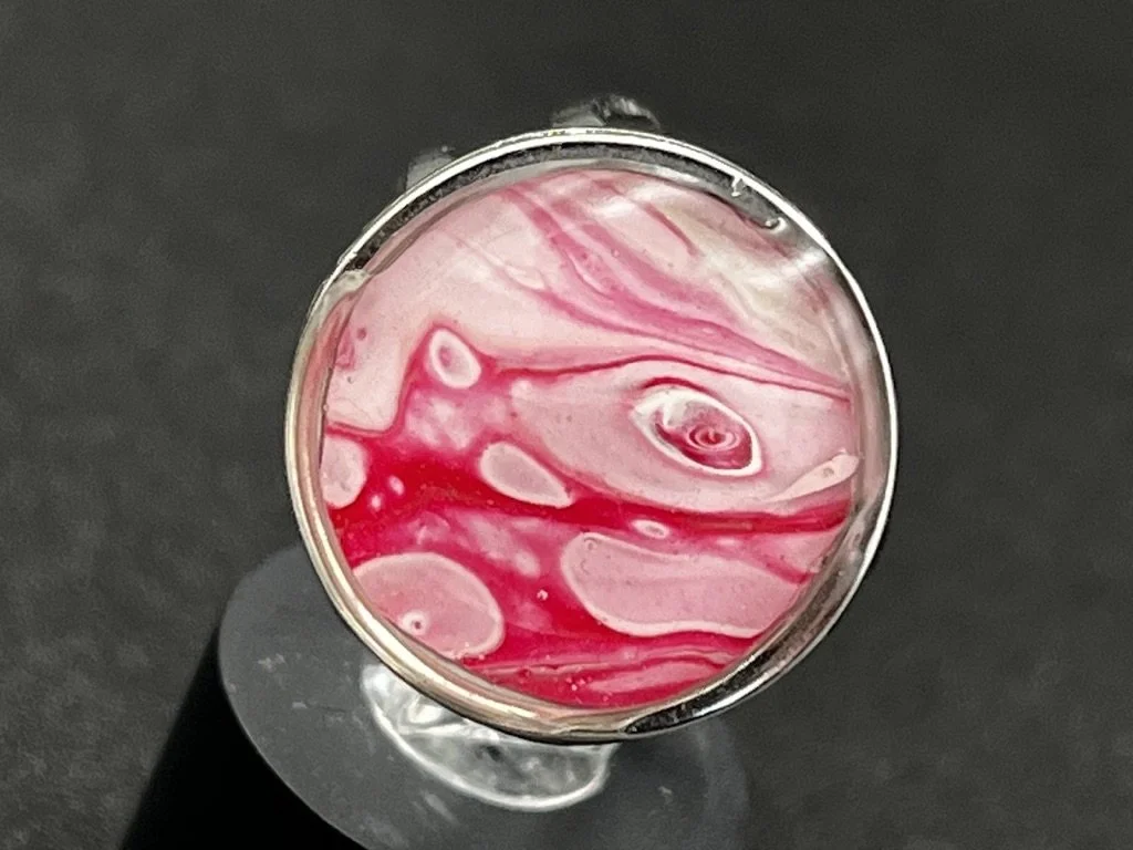 Image 1 of 4 Image 2 of 4 Image 3 of 4 Image 4 of 4 Cherries Jubilee Round Medium Adjustable Ring $18.00 Swirls and bubbles of cherries and cream. Add To Cart Added! Swirls and bubbles of cherries and cream.